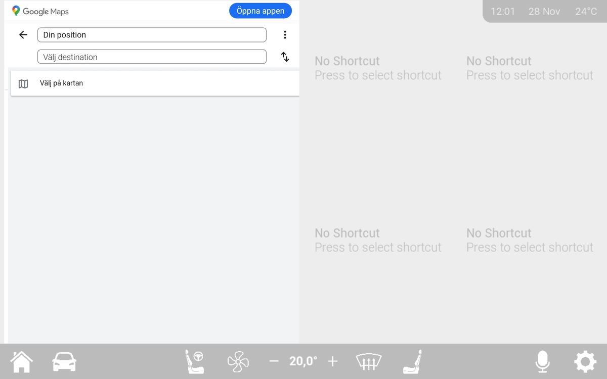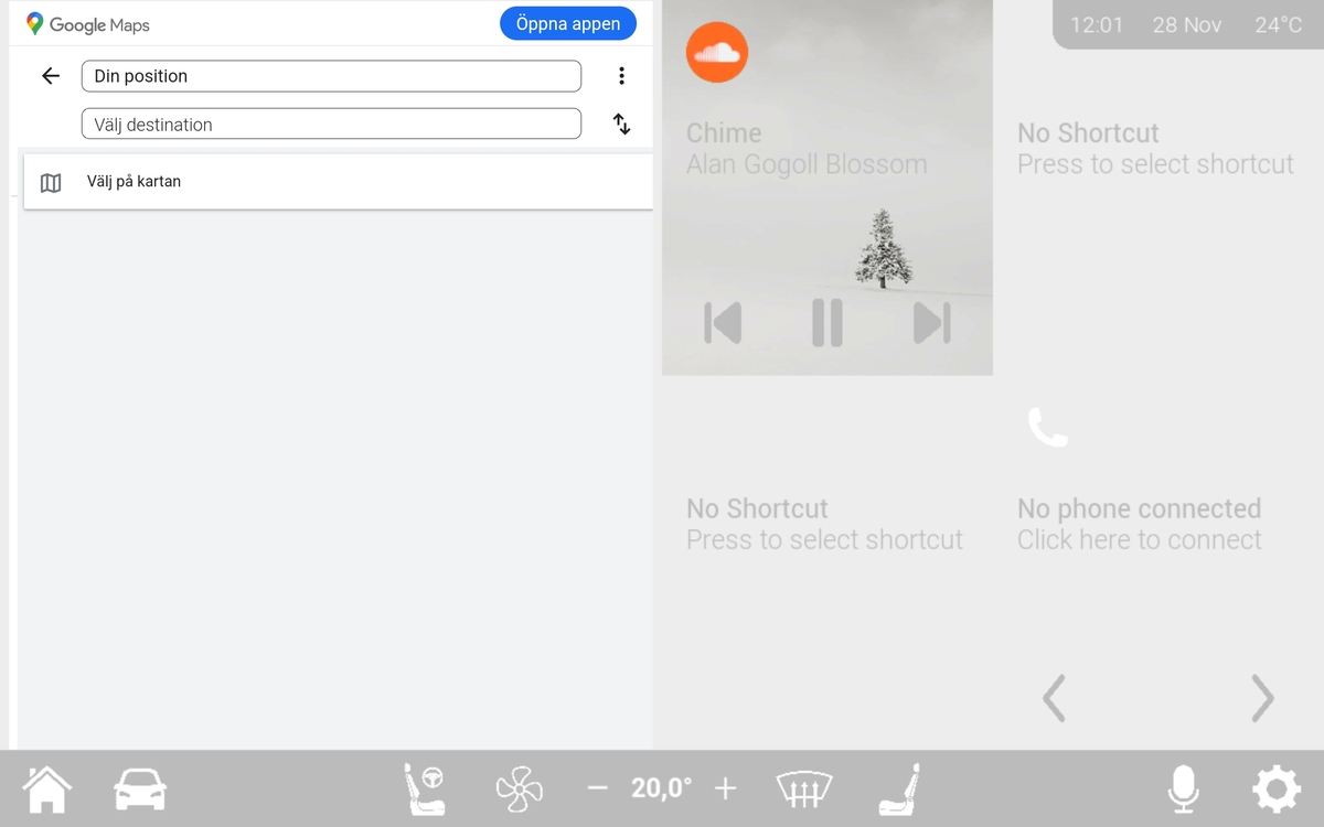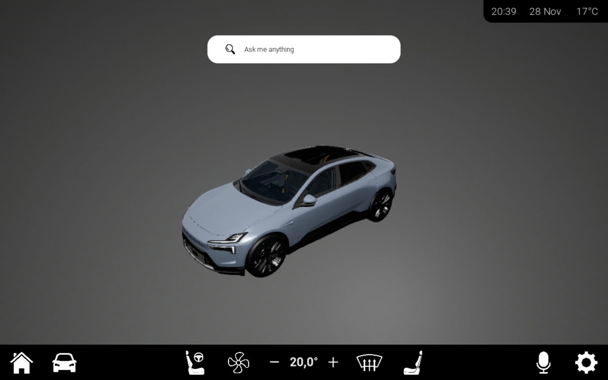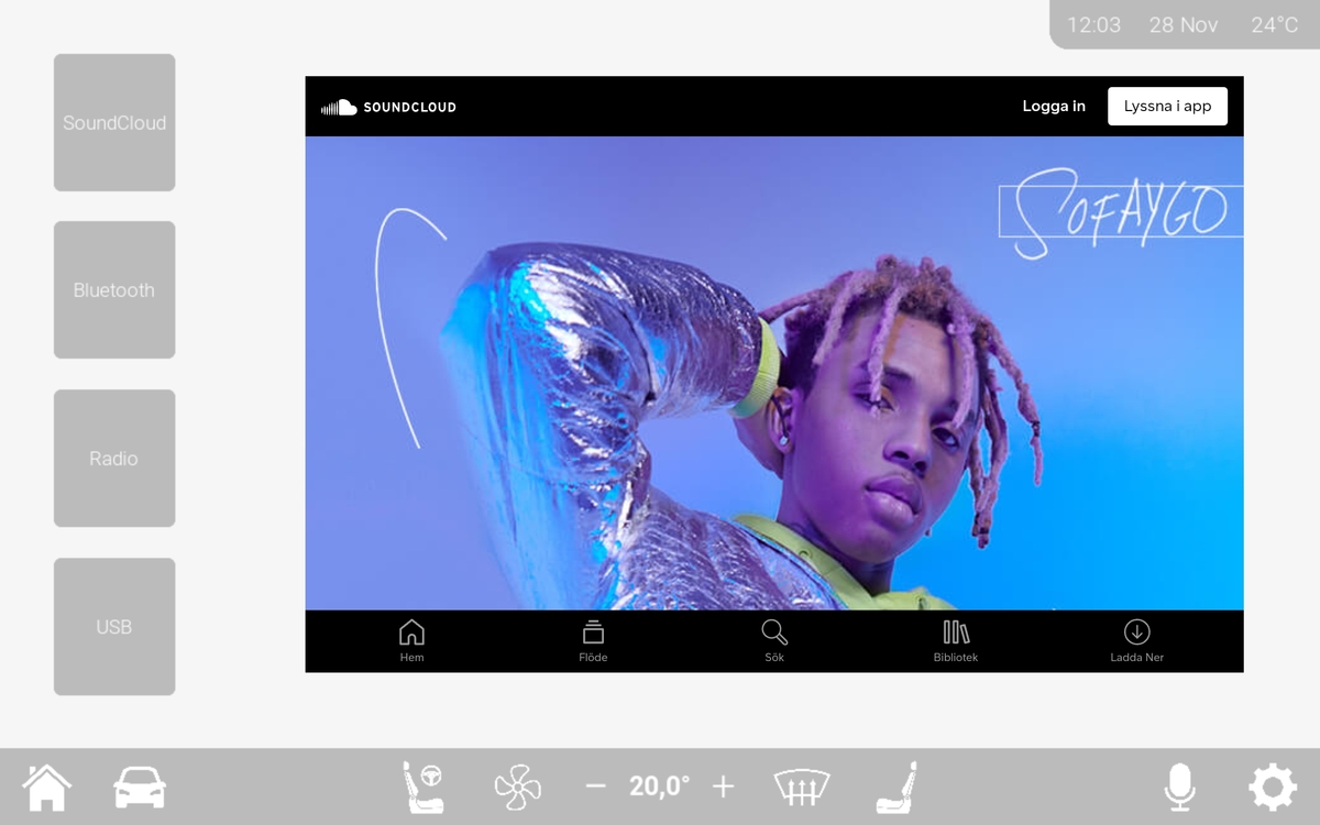 The application was enhanced through integration with Arduino, enabling live sensor feedback and physical button interactions. I implemented custom UI themes based on environmental lighting, simulated airflow animations, Bluetooth connectivity, and web-based APIs like Google Maps and SoundCloud. The system was designed with scalability, usability, and realistic functionality in mind, and successfully tested on a tablet with the whole intention that this could be applied to a real automtove WX scenario.