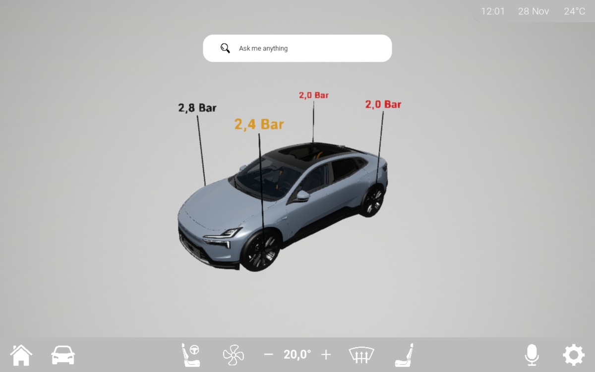 As part of my thesis project, I developed an advanced Car System Display (CSD) application for Android tablets using Unreal Engine 5.3, integrating both software and hardware to simulate a vehicle's center console. This included real-time diagnostics through an interactive "Car Health" section, with features such as tire pressure monitoring, washer fluid indicators, and battery status visualizations.